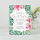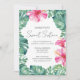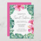 Födelsedagsfest inbjudan har vibrerande fuchsiska rosa tropiska hibiscus-blommor med monstera handflatan löv. Ett lysande val för sommaren bassäng party eller söt 16-årsdag med ett tropiskt Hawaiiskt luau-tema. Victoria Grigaliunas från Do Berätta för en Belle.