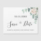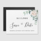 Ett modernt Spara datum magneter-kort för en 50:e (eller någon ålder) födelsedagsfest. På framsidan: En chic vit bakgrund som dekoreras med vattenfärgad grönt eucalyptus greenery och en vit blommigt, blomma. Anpassa och lägg till datum och namn/ålder 50. Svart färgad brev. Texten: Spara datumet skrivs med ett stort trendig-handskript i stil.