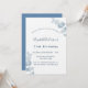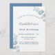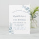 En vit bakgrund, dekorerad med mörkblå eucalyptus-stammar, spriggar. Anpassa och lägg till information om namn och party. Baksida: dammig blå bakgrund.