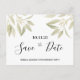 En elegant och enkel Spara datumkortet för en 50:e (eller någon annan ålder) födelsedagsfest. En chic vit bakgrund som dekorerar oliv grönt vattenfärgade botaniska blommigtar, grön. Mallar för ett datum och namn/ålder 50. Svart färgad brev. Texten: Spara datumet skrivs med ett stort trendig-handskript i stil. Tillbaka: oliv grönt bakgrund färg. Tips! Om du inte vill att det ska se ut som ett vykort klickar du på anpassa, går till baksidan och tar bort delaren och lägger till frimärke.