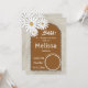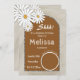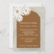 Ett inbjudet kort för elegant med tre stora vita daisy, en karamellbrun och silver arche som visas på ett helt vitt glas mönster. I det nedre hörnet av högerna finns det en anpassningsbar bild som nämner födelsedagskalan.