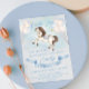 Hästmatad födelsedagsinbjudan med illustration av en underbar baby-häst och Watercolor-saga guld-stjärnor med pastel färg-ballonger och blått band för firande!
