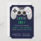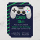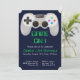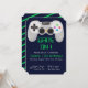 Coola videospelsstyrenhet, spelteman, pojkar födelsedagsfest inbjudan. Mörk blått bakgrund med stöd för grönt och rand mönster. Många-malltexten linjer för information.