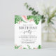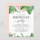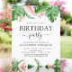 Budgeterad Grönt Tropical Handflatan och Rosa Blommigt Flowers Watercolor Födelsedagsfest inbjudan omfattar vacker och elegant-manustypografi med moderna botaniska rosa blommor och tropiska hawaiiska grey för den speciella 16:e, 18:e, 21:e, 30:e, 40:e, 50:e, 70:e födelsedagen.