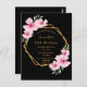 En tropisk blommigt 50:e (eller i alla åldrar) födelsedagsfest inbjudan med rosa hibiscus blommor, grön och faux guld geometric ram. Elegantens svarta bakgrund. Mallar för ett namn skrivet med ett modernt hanterat stil-skript, mallar för party-information. Svart text. Perfekt för en sommar, bassäng eller strand firande! Bakåt: svart bakgrund färg. Tips! Om du inte vill att det ska se ut som ett vykort klickar du på anpassa, går till baksidan och tar bort delaren och lägger till frimärke.