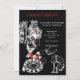 Anpassningsbar inbjudan till fest med kasino tema, illustrerad med vita och röda linjeteckningar på svart bakgrund med hjärter, ruter, klöver och spader kortsviter, roulettehjul, tärningar och poker marker. Perfekt för födelsedagsfester, välgörenhetsinsamlingar eller andra festliga tillställningar.