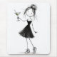 En söt teckning av en flicka iförd svart cocktailklänning och sneakers håller en martini mot en vit bakgrund.