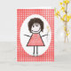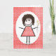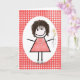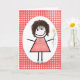 Söt stickfigur tjej med lockigt hår, sneakers, ginghamsklänning, pärlhalsband och en bukett tusenskönor på röd-vit gingham bakgrund.