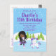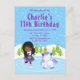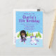En söt afroamerikansk flicka i en mörkgrå kappa, lila handskar, en scarf och skridskor som åker på en isrink bredvid en förtjusande enhörning med lila och grön man och svans. I bakgrunden finns snötäckta träd, snötäckta kullar och en klarblå himmel med fallande snö. Grafik av PrettyGrafik