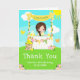 Denna söta och fantasifulla tack-kort visar en flicka med brunt hår och ljus hy på en gul lemonade-stånd som är dekorerad med blommor och flaggor. I bakgrunden syns en blå himmel, solsken och fjärilar. Texten kombinerar dekorativa och sans-serif-teckensnitt för en stilren och modern look. Detta är perfekt för en sommarfödelsedagsfest.