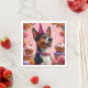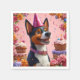 Glad hund som bär en födelsedagshatt bland färgglada cupcakes, blommor och festliga dekorationer som firar en spännande och glad tillställning.