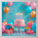 Festlig födelsedagsscen med en rosa-dekorerad tårta med brinnande ljus, presentaskar, färgglada ballonger och livfulla konfetti på en ljus bakgrund, som utstrålar glädjefull firande och glad feststämning.