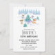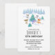 Födelsedagsinbjudan med en fantasifull skogsscen. Glada skogsdjur dansar runt en grön gran med presenter under. Glad och lekfull akvarelldesign.