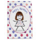 Cute stick-flicka med bobbat hår, blå glasögon och polka-punktklänning på matchande polka-punkt mönster för födelsedag.