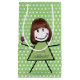 Smilande stickflicka med glas, hår från vin och med grönt och vit polka-punktbakgrund för födelsedagen. Text på hennes klänning kan redigeras eller tas bort.