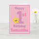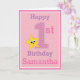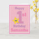 En rosa etta dekorerad med ljusrosa prickar. En söt glad gul stjärna med stora blå ögon. Nedan finns en textmall för att lägga till födelsedagsflickans namn.