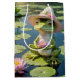 En groda som bär en halmhatt prydd med blommor sitter på ett näckrosblad med rosa näckrosor och näckrosblad runt grodan i en lugn damm.