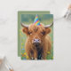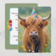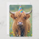 En höglandsko står i en äng med färgglade vilda blommor och bär en födelsedagsfesthatt.