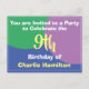 Inbjudan till en speciell födelsedagsfest med namn och antal år. Födelsedagsinbjudan för en 9-åring. Lägg till dina egna detaljer.