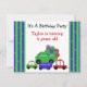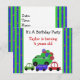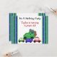 En rolig födelsedagsinbjudan med färgglada vagnar och bilar. Grön, blå och röd. Den gröna vagnen är full av färgglada födelsedagsballonger. Anpassa med all din födelsedagsinformation som önskat.