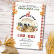 Denna inbjudan visar en förtjusande bild av staplat hö, söta lantbruksdjur och åtföljs av andra illustrationer relaterade till bondgården, vilket skapar en livlig atmosfär på gården. Färgglad och komplett med en kant dekorerad med charmiga grödor, är det den perfekta inbjudan för att sätta tonen för en rolig bondgårdstematisk fest.