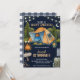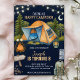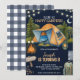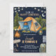Födelsedagsinbjudan med campingtema. Ett tält står under strängar av ljus med en halvmåne och tallar. Texten lyder "Alla glada campare kallas! Joseph fyller 8." En lägereld och en lykta tillför värme.