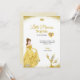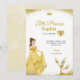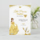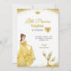 Födelsedagsinbjudan med en prinsessa i en gul klänning och en kandelaberkaraktär. Texten lyder "Lilla prinsessan Sofia fyller fem", med eleganta guldfärgade accenter.