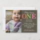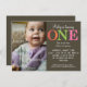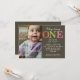 Ordet "ETT" sticker ut på denna trendiga födelsedagsinbjudan för ett barn som fyller ett år. Varje bokstav är behandlad med ett annat färgglatt mönster. All information om festen skrivs ut mot en rik brun bakgrund. Lägg till en bild av barnet till vänster och lägg till eventuell extra information på baksidan eller ta bara bort den för att lämna baksidan tom. Finns tillgänglig med matchande produkter.