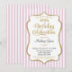 En elegant födelsedagsinbjudan i rosa och guld med randiga rosa och vita ränder och en textram med guldglitter. Glittertextramen på denna klassiska och stiliga födelsedagsinbjudan har en skugga som ger en upphöjd effekt. Denna rosa och gula inbjudan kommer säkert att glädja den speciella födelsedagsstjärnan i ditt liv. Perfekt för stora födelsedagar som 18:e 20:e 21:a 30:e 35:e 40:e 45:e 50:e 55:e 60:e 65:e 70:e 75:e 80:e 85:e 90:e 95:e och 100:e ...eller vilken ålder som helst! Även för tonåringar och pre-teen, 10 11 12 13 14 15 16 17 år gamla.