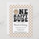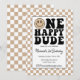 Inbjudan till en glad killes 1-års födelsedagsfest. Rutig beige bakgrund och svarta accenter