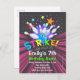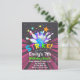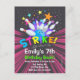 Bowling födelsedags inbjudan vykort med en bowlingklot som slår käglor med starka lysande färger och stjärnor på en mörk bakgrund som säger Strike Let's Bowl For. Detta är en bra inbjudan för kosmisk glömbowling eller någon bowlingfest och get-together.