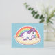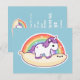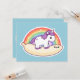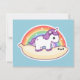 Supersöt lila babyenhörning som rider på glad banan-vän med regnbåge. Personalisera baksidan med din festinformation.