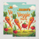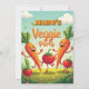 Ge glädje åt ditt barns speciella dag med denna bedårande födelsedagsinbjudan till grönsaksparty! Med dansande tecknade morötter, tomater och ärtor, plus en redigerbar fras för ditt barns namn, sätter denna inbjudan den perfekta tonen för en rolig och hälsosam tematiskt party. Perfekt för barn som älskar färgglada, lekfulla designs.