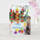 Färgfyllt gratulationskort för födelsedag med ett foto av en vit, frostad kaka med färgstarka kandispjäser överallt och vita, färgstarka ljus. Text, på framsidan, Grattis på födelsedagen, med en födelsedag hälsning inuti kortet. Anpassa all text inuti och ut till kostym efter dina behov. Underbart födelsedagskort för alla ändamål som är perfekt för alla eller alla åldrar.