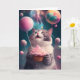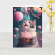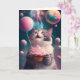 Födelsedagskort med en söt katt med en rosa cupkaka och rosa ballonger. Det här kortet kan enkelt överföras till andra storlekar och format, vilket gör att du kan anpassa det efter dina behov helt och hållet kostym.