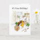 Ett födelsedagskort med en äldre man som slappnar av i sin trädgårdsbyggnad med tidningen, en dryck och hans hund. Texten på framsidan kan snabbt och enkelt ändras på begäran via min butik.