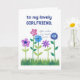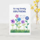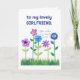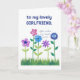 Ett söt Birthday Card för en flickvän, med en rad rosa, blått och lila blommor som skjuter upp sig genom gräset, från en handmålad papper kollage av Judy Adamson. Kontakta mig genom affären om du vill att texten på framsidan ska ändras och om du vill kan byta eller ta bort den inre hälsning.