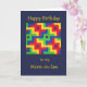 Ett födelsedagskort för en mor-i-law, med en smart och färgstark abstrakt-lapptäcke från en cot-quilt-film av Judy Adamson.