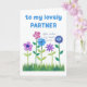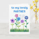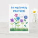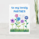 Ett söt Birthday Card för en partner, med en rad rosa, blått och lila blommor som skjuter upp sig genom gräset, från ett handmålat pappert kollage av Judy Adamson. Kontakta mig genom affären om du vill att texten på framsidan ska ändras och om du vill kan byta eller ta bort den inre hälsning.