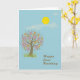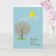 Junifödelsekort med kreativ blommar träd, Sol och blå bakgrund. Gräet under träd är en fotobuskborst av bsilvia. Det är välkommet att ni lägger till ert eget budskap på kortets insida, och om ni borde köpa det, tack så mycket.