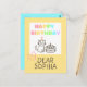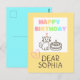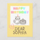 Det här är ett födelsedagskort med lycklig regnbågskatt. En katt i en hatt och en tårta är så söt. Färgglad regnbågstext och varmt gult och himmelblått är harmoniserade. Det är en meningsfull gåva till din nära och kära. Köp din idag! Ha det så kul.
