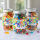 Den här ljusa och glada etiketten för mat och vin med texten ”Happy Birthday” förvandlar direkt varje flaska eller förpackad present till en färdig present. Designen exploderar av mångfärgade ballonger, konfetti och stjärnakcenter som alla ramar in det feta ”HAPPY BIRTHDAY”-meddelandet i regnbågsbokstäver i mitten. En livlig blandning av rosa, gula, gröna och blå nyanser ger en rolig och festlig stämning som sticker ut vackert på vinflaskor, kakburkar, påsarna med snacks eller partajfavoriter.