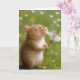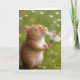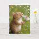 En liten mus som står på bakbenen och blåser maskrosfrön i luften mot en bakgrund av frodig grön gräsmatta, vilket skapar en fantasifull stämning.