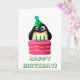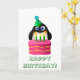 En söt tecknad penguin med en grönt fläckad party-hatt och en stor rosa födelsedagskalas med tre gröntar ljus. Underbar gåva till en tredje födelsedag - eller en penguin-älskare-födelsedag!