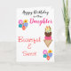 Grattis på födelsedagen Dotter önskemål. Anpassa för vem som helst. Vackra och söta är skrivet på framsidan i rött skript. Söt ljusa blommor i rosa Blue gult grönt orange, och din vanilj, choklad, jordgubbssprinklad glasspropp, kort med fingrar mot vit bakgrund. Lämna speciellt meddelande inuti eller anpassa. Mindre färgstarka blommor och luddig löv på baksidan. Originalteckning och Kortets fullständiga design © TamiraZDesigner