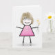 Söt stickfigur med hår, pärlhalsband, rosa ruty dress, glasögon, sneakers och håller en bukett prästkragar för en rolig födelsedag.