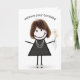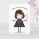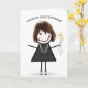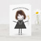 Söt stickfigur tjej med hår, sneakers, prickig klänning, pärlhalsband och en bukett prästkragar.