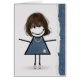 Söt stickflicka med hår och iförd sneakers, pärlhalsband och blå jeanskjol på reva papperskant med blå denimkant.