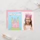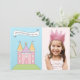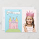 Den här charmiga prinsesslottets födelsedagsfotoinbjudan kombinerar det illustrerade rosa slottet och "Samla alla riddare och fina möer, också" rullningsband med ett utrymme för ditt barns foto till höger. Den rosa baksidan har en lavendelformad ram med en flerskiktig födelsedagstårta krönt med en gyllene krona för att visa födelsedagsdetaljer. Rosa, lila, blå, gula och gröna nyanser skapar en lekfull sagokänsla. All text är helt anpassningsbar.