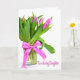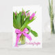 Ljusa rosa-tulpaner i vas med polka-punktbåge för Dotter.